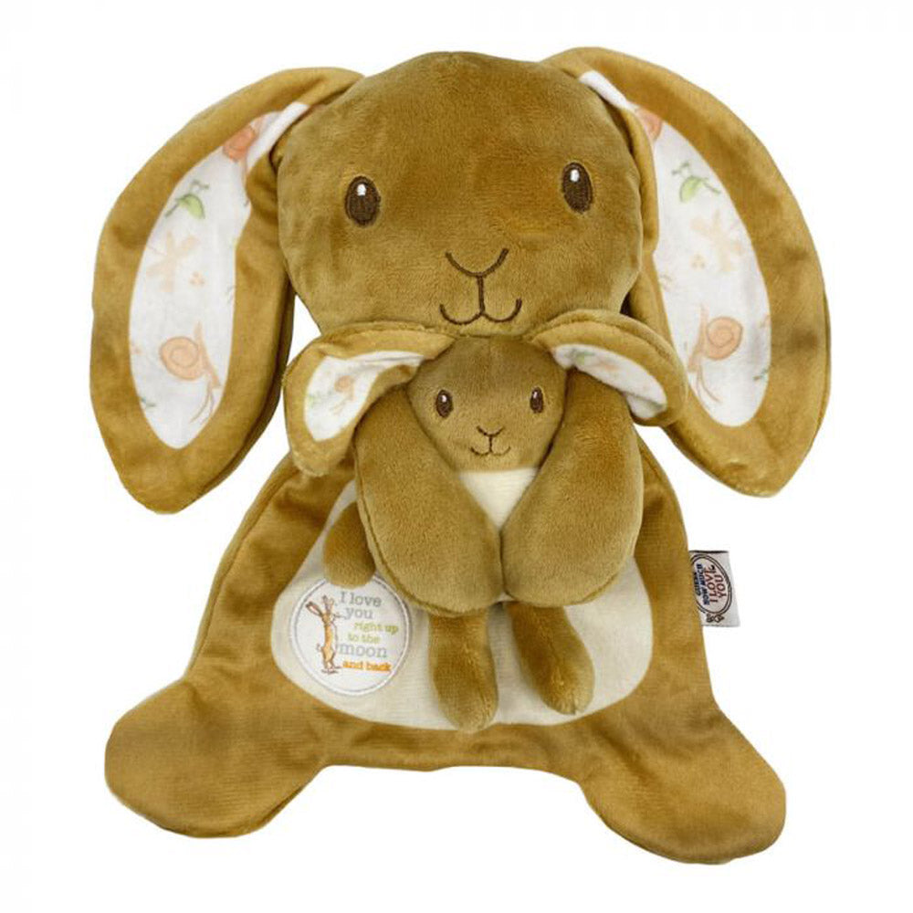 The Guess How Much I Love You Lovey is an ultra-soft, floppy lovey, with just the right amount of padding to comfort and make on-the-go snuggles easy. The lovey features patterned ears and also has an adorable patch with a quote from the story. The almost-flat design also makes the lovey convenient to transport, folding small for easy storage in smaller bags.