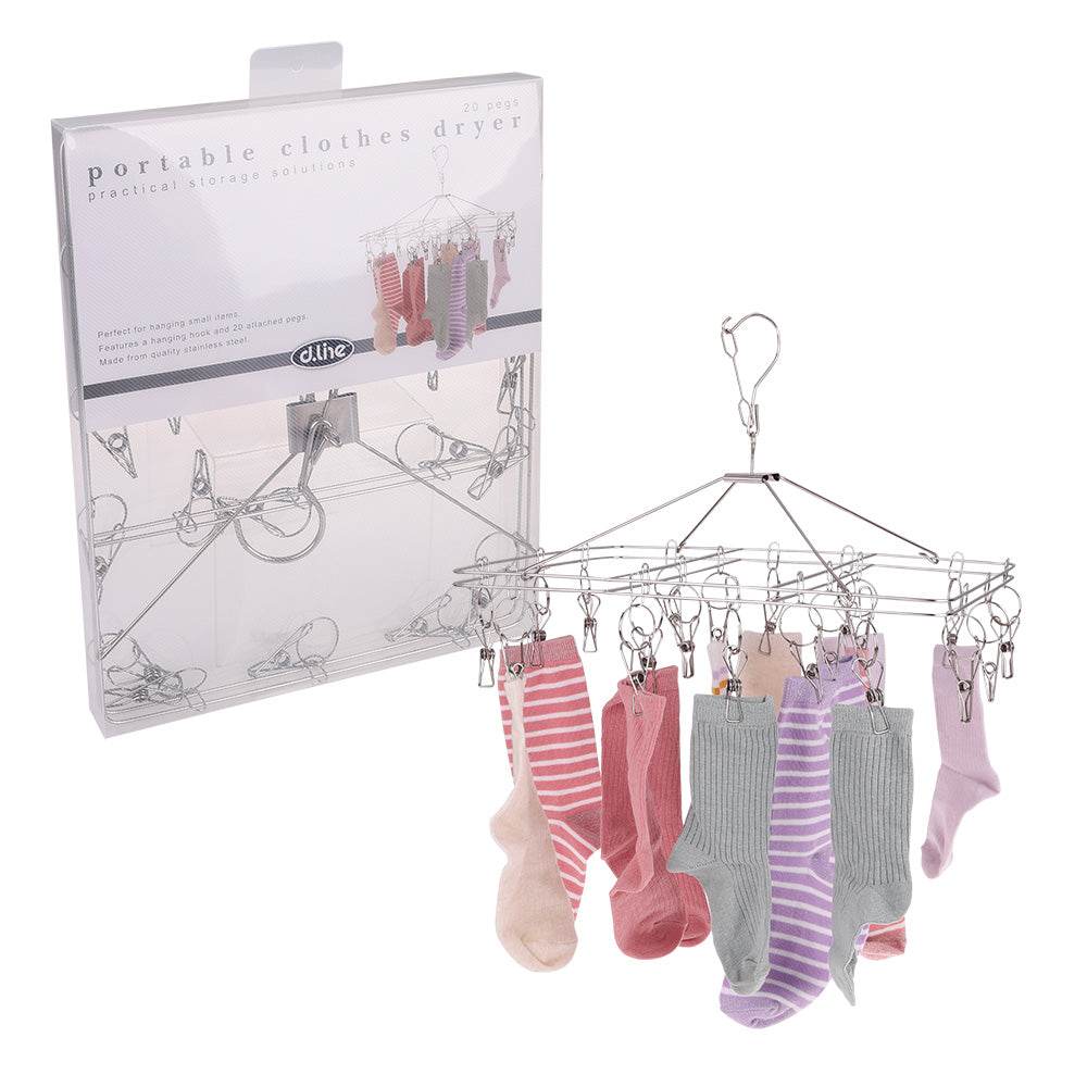 Dette rustfrie stålrektangel tøj tørretumbler - 20 pinde fra D.Line er perfekt til at hænge små genstande, selv i det mest kompakte rum. Med en hængende krog og 20 tilknyttede knagter er denne kompakte tørretumbler fantastisk til at rejse og foldes væk for nem opbevaring.