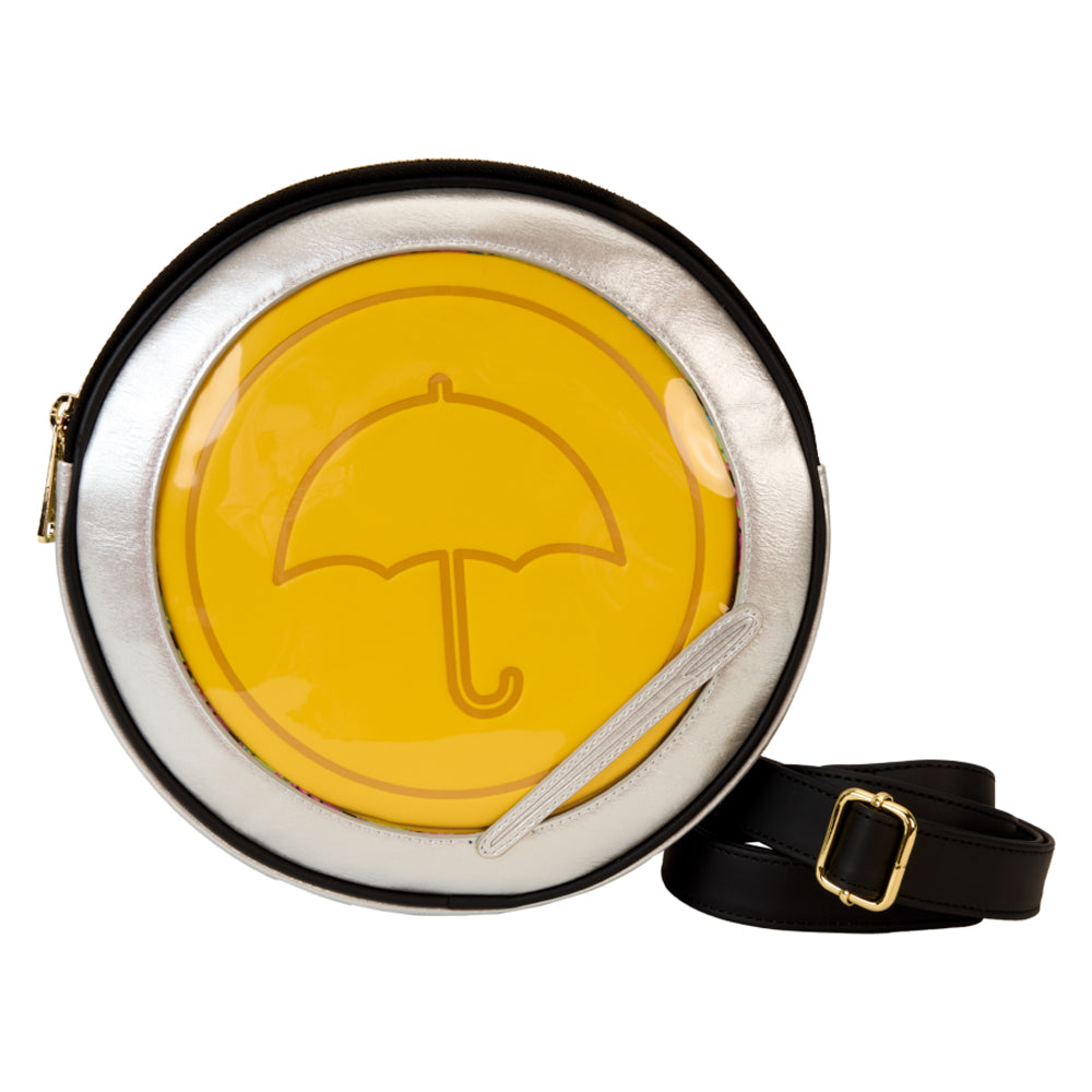 Capture iconic moments from the Netflix series with this accessory, which showcases the Dalgana Candy challenge. This fully figural bag, in the circular shape of a candy tin, holds a reversible and detachable yellow coin bag. The coin bag displays the umbrella shape on one side, and a triangle on the other. Silver metallic faux leather adds extra sparkle, along with clear PVC material on the front. A die-cut applique of the cutting utensil for this game adds a realistic detail. Pack your daily essentials and take on any challenge in style.