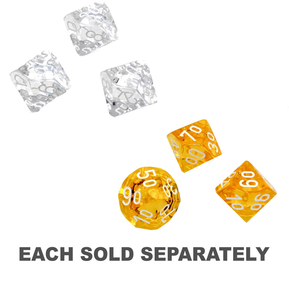Translucent Polyhedral Clear/white Tens 10 ~ Multiple loose dice are pictured to show all sides and possible color variations. Item Code is for individual dice.