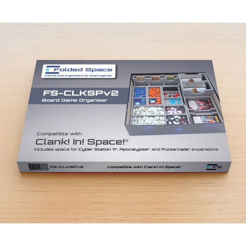 Insert compatible with Clank! In! Space!, including Cyber Station 11, Apocalypse!, and Clank! In! Space! Adventures: Pulsarcade. The design provides both efficient storage and improved game play. Many of the trays can be utilised during the game, and they greatly aid set-up and clear-away times. There is space for all cards to be sleeved.