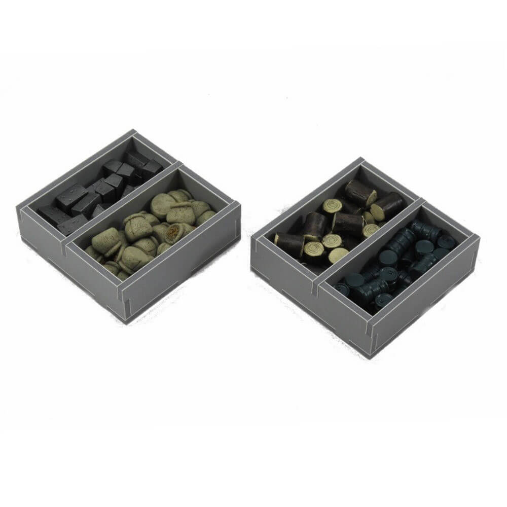 Es gibt ausreichend Stauraum für die realistischen Ressourcenmarker, die Metallmünzen und auch für sieben Kampfscheiben, falls Sie welche haben.