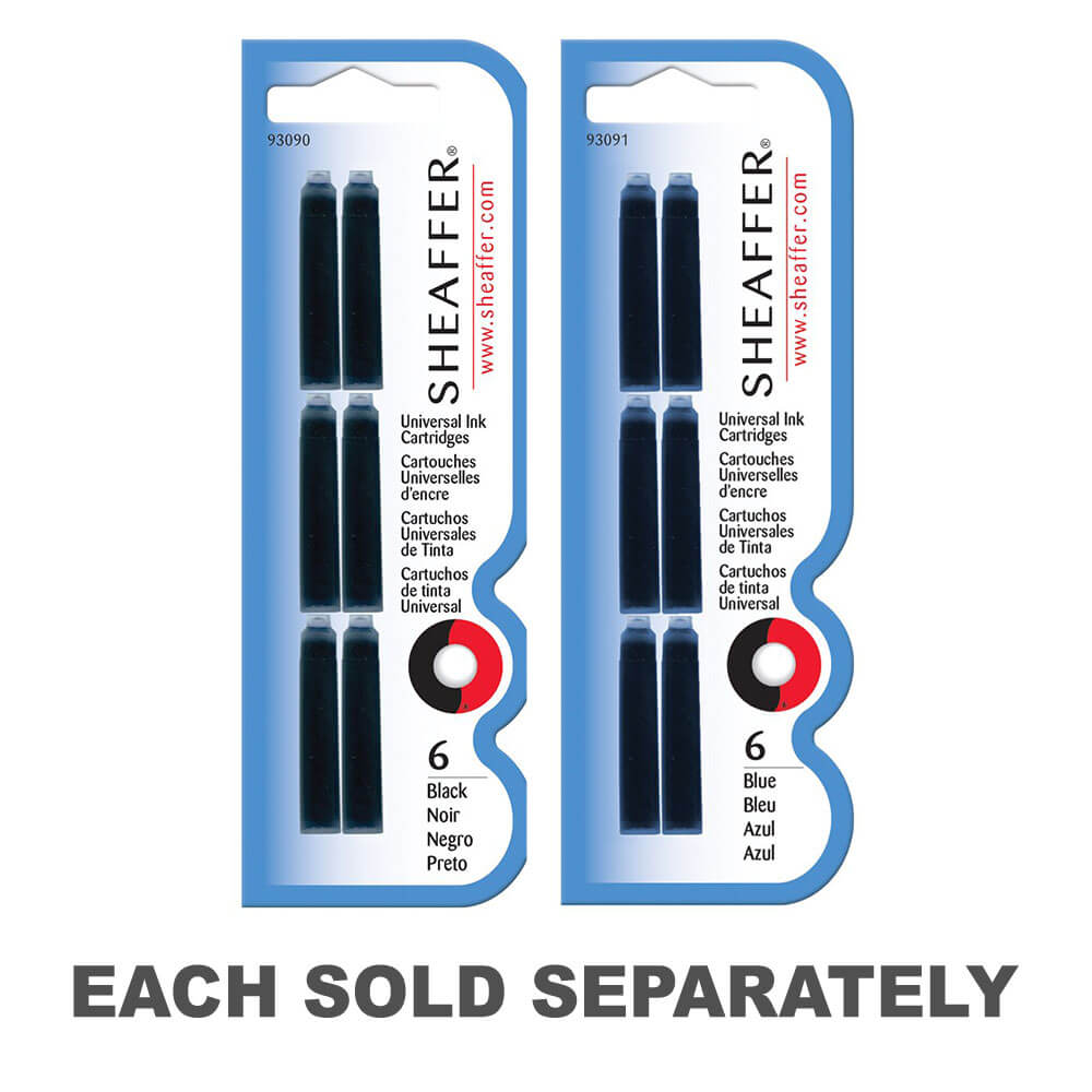 Sheaffer Scrip Universal-Tintenpatronen. Die speziell formulierte Sheaffer Scrip Ink gewährleistet eine lange Schreiblebensdauer und einen reibungslosen Tintenfluss auf das Papier, verpackt auf Blisterkarten.