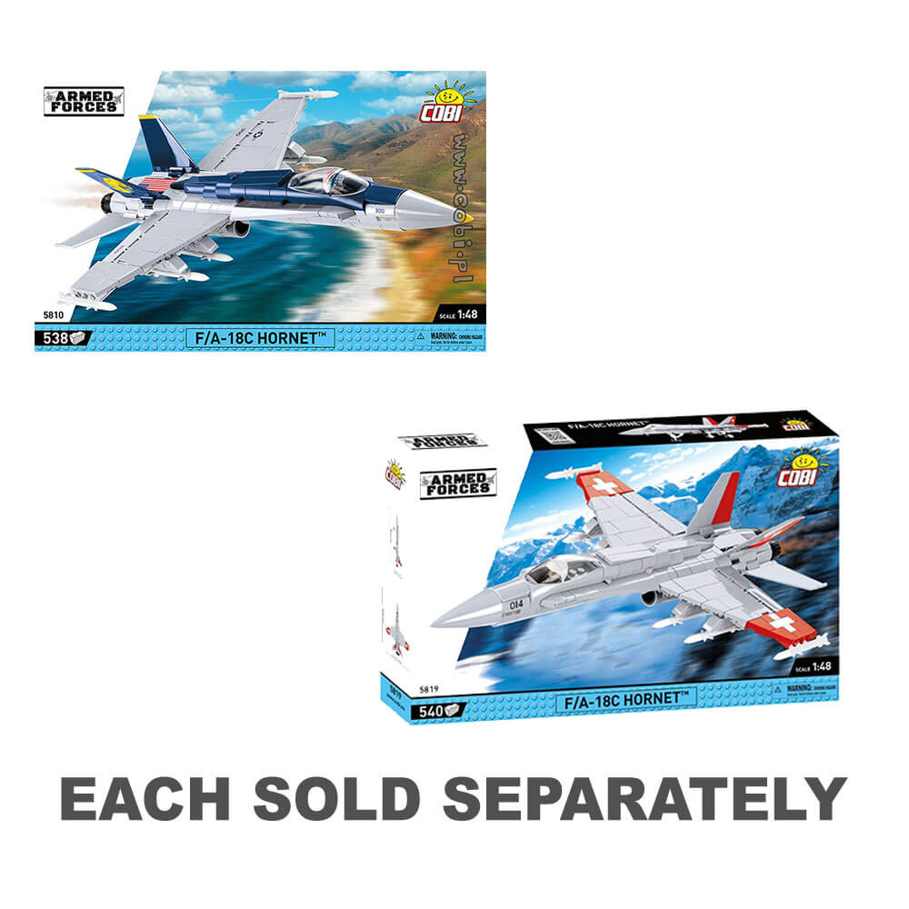 The F/A-18C Hornet is a unique multi-role fighter model in the colors of Switzerland. The plane was prepared in a 1:48 scale model, using 540 COBI construction blocks. The set includes high-quality prints imitating the painting of the original aircraft. The model is equipped with a folding undercarriage and rotating wheels. Under the wings is a large arsenal of weapons. You can place a special pilot figure in the cabin. The set also includes a block display stand and a plate with the name of the aircraft. This exclusive, licensed set is aimed at everyone, regardless of age, including aviation and military fans. The plane looks equally attractive in an office or in a teenager's room.