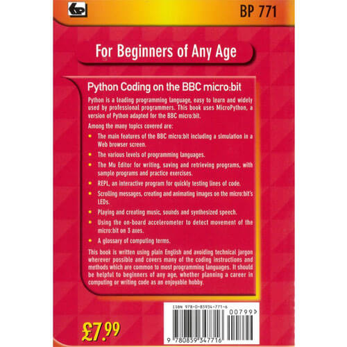 Python es un lenguaje de programación líder, fácil de aprender y ampliamente utilizado por programadores profesionales. Este libro utiliza Micopython, una versión de Python adaptada para la BBC Micro: Bit. Este libro está escrito en inglés simple y evita la jerga técnica siempre que sea posible para cubrir las instrucciones de codificación comunes a la mayoría de los lenguajes de programación. Adecuado para cualquier edad o nivel de experiencia.