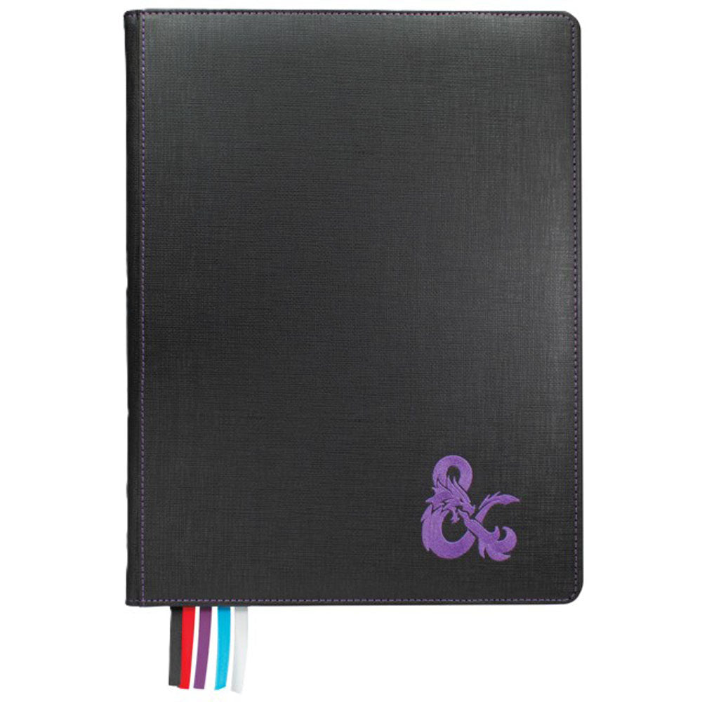 Cast a ward of protection on your treasured D&D source books with the Premium Book Cover for Dungeons & Dragons. The textured leatherette cover features a rigid layer of protection for both the front and back of the book, while remaining flexible at the binding for ease of use. Simply slip the back cover into the back inner pocket and use the front elastic strap to either hold the front cover open, or secure the book closed by pulling it over the back cover. Easily reference important pages marked by 5 attached and color-coded ribbons (black, red, blue, purple, & white). Premium Book Covers pair beautifully with other Ultra PRO premium accessories for Dungeons & Dragons. Each book cover features embroidered labeling on the binding as well as the classic D&D ampersand on the front cover, each complimented by color-matched stitching