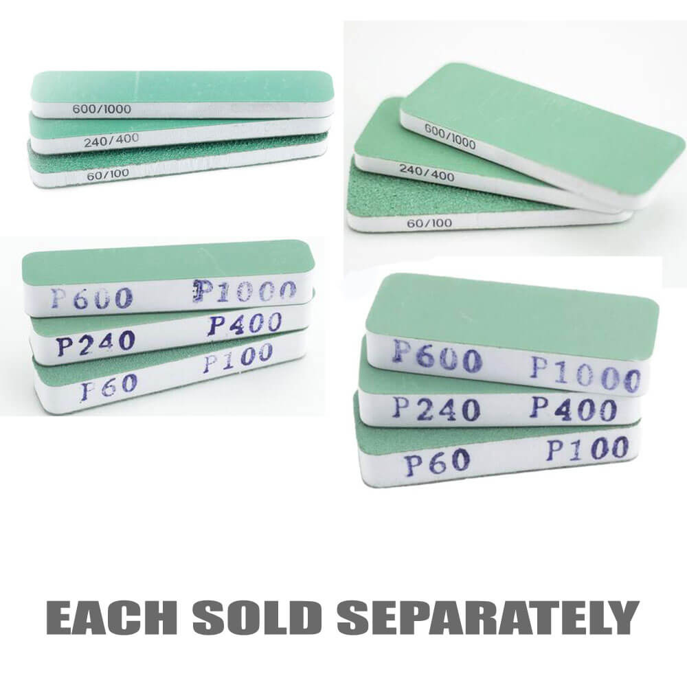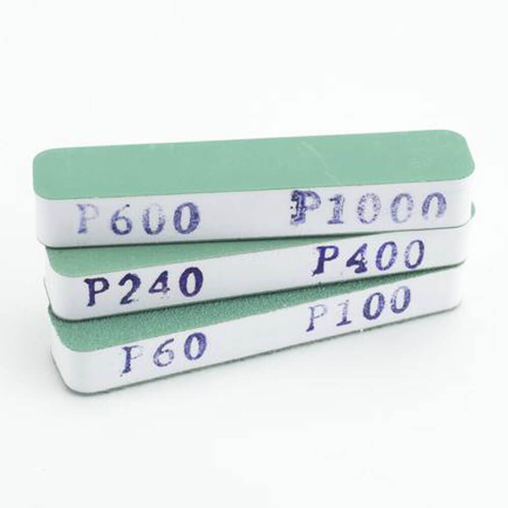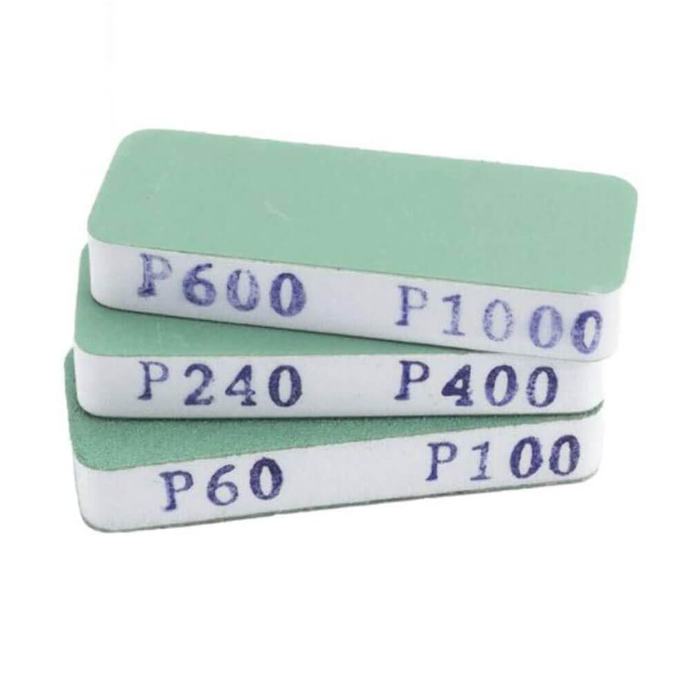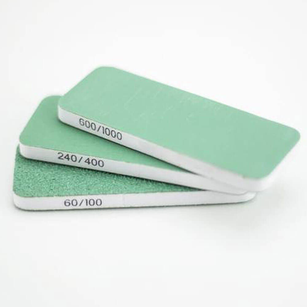 Las lijadoras flexibles son un juego de 3 y son lavables y reutilizables. Ofrecen las siguientes combinaciones de grados: Grueso (60/100): Eliminación efectiva de material. Medio (240/400): Mezclado y alisado. Fino (600/1000): Acabado y pulido.