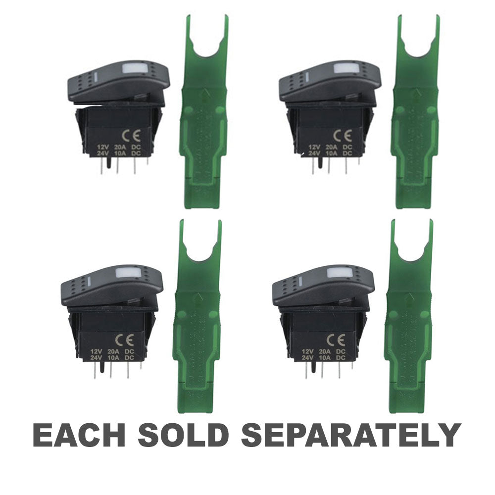 Questi sono i superbi interruttori a bilanciere che hai visto di recente nelle cabine degli incrociatori per motori di lusso di 70-100 piedi. Sarebbero belli nel tuo 4WD, camper, roulotte o qualsiasi altra applicazione. L'interruttore di base fornito (classificato a 12V 20A, 24V 10A) è dotato di un'illuminazione a doppia LED (bassa di Off, in alto in posizione On), una copertura a rocker standard e una gamma standard di decalcomanie per personalizzare l'interruttore all'applicazione. Le decalcomanie tipiche sono simboli per: tergicristalli, corno, riscaldatore, ecc.; Ci sono dozzine di queste decalcomanie incluse.