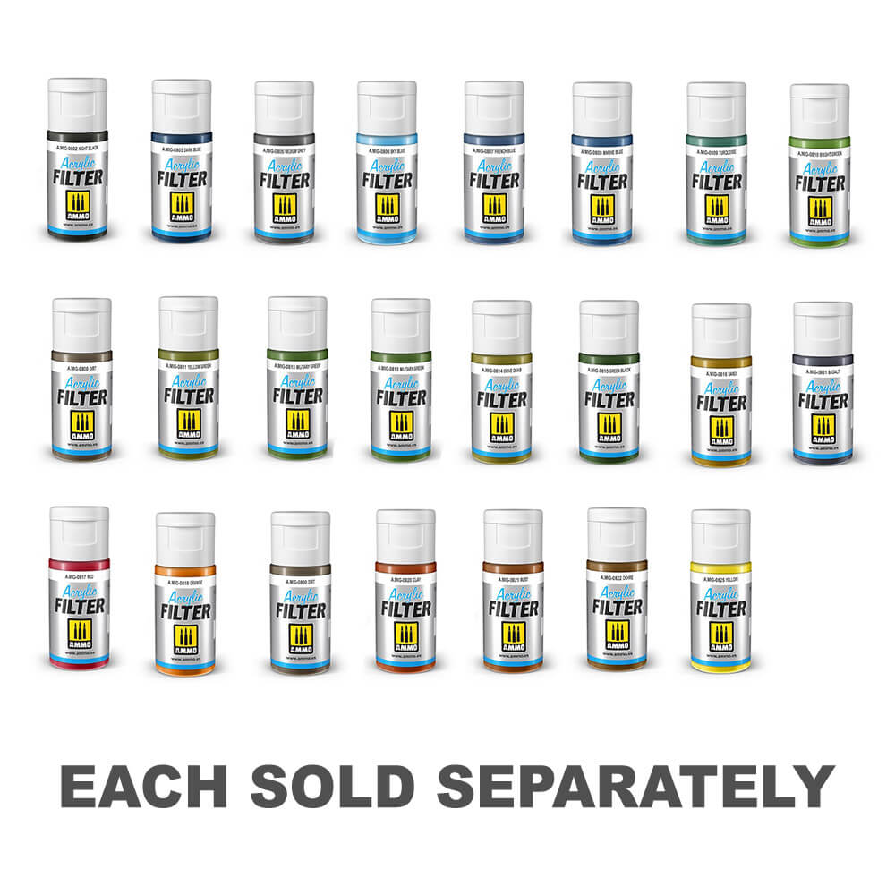 I nuovi filtri acrilici di AMMO sono progettati per essere applicati direttamente al modello. Questa nuova gamma consente di aggiungere variazioni di colore alle tue miniature, armonizzare vari colori di camuffamento o distinguere le aree con un tono diverso. Il filtro acrilico può essere facilmente applicato con un pennello, che evita la necessità di un mascheramento complicato. Inumidire il pennello con il prodotto e applicarlo senza inondare la superficie. Grazie alla formulazione innovativa, i filtri acrilici possono essere ritoccati o eliminati semplicemente e facilmente con acqua durante il tempo di asciugatura prolungato, ogni filtro si asciugherà completamente in 24 ore. Questi filtri versatili possono anche essere applicati in aereo per un numero infinito di effetti. Grazie alla vasta gamma di 30 colori disponibili, non dovrai creare miscele complesse, regolare per il corretto rapporto di assottigliamento o regolare il tono all'ombra prevista. Ogni colore può essere mescolato tra loro o colorato con altri acrilici di munizioni