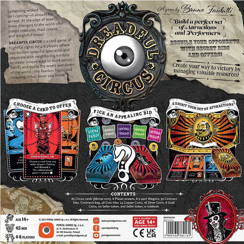 Dreadful Circus est un jeu de collecte de sets dans lequel vous essayez de créer le cirque le plus réussi! Le jeu est livré avec une touche unique - au cours du jeu, les joueurs achètent des cartes qui ont des règles de score final uniques. Au fur et à mesure que le jeu progresse et que de plus en plus de cartes sont gagnées, chaque joueur a développé ses propres règles de score finales. Aucun jeu n'est le même, aucun joueur à la table ne marque de la même manière. C'est un concept unique dans lequel les joueurs, sur le nombre de rounds, construisent la façon dont ils obtiendront à la fin. Dreadful Circus est conçu par l'icône de l'industrie Bruno Faidutti, est pour 4 à 8 joueurs et joue en 30 à 40 minutes. Le jeu est un jeu de cartes extrêmement intelligent pour les joueurs.