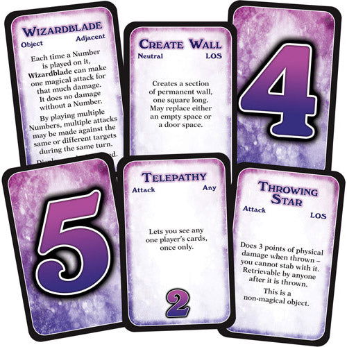 At the heart of the game is a deck of cards that the players use to cast spells, power up spells, and augment movement. Each turn, players can move up to three spaces (or more with the use of number cards). However, the goal is to penetrate the other players' sections of the maze, pick up one of their treasures, and bring it back to your home base. The first player to capture two such treasures or kill all the other wizards wins.
