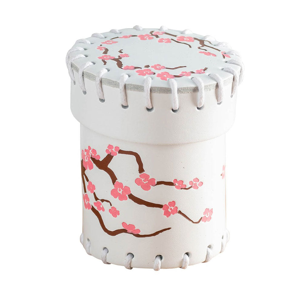 その経験は、この日本の革製サイコロカップを作成するように促しました。私たちは白い色の自然な革で作り、カラフルなプリントで蓋と体を飾りました。ピンクの花で生き返り始めている茶色の桜の枝が茶色の桜の枝を示しています!
