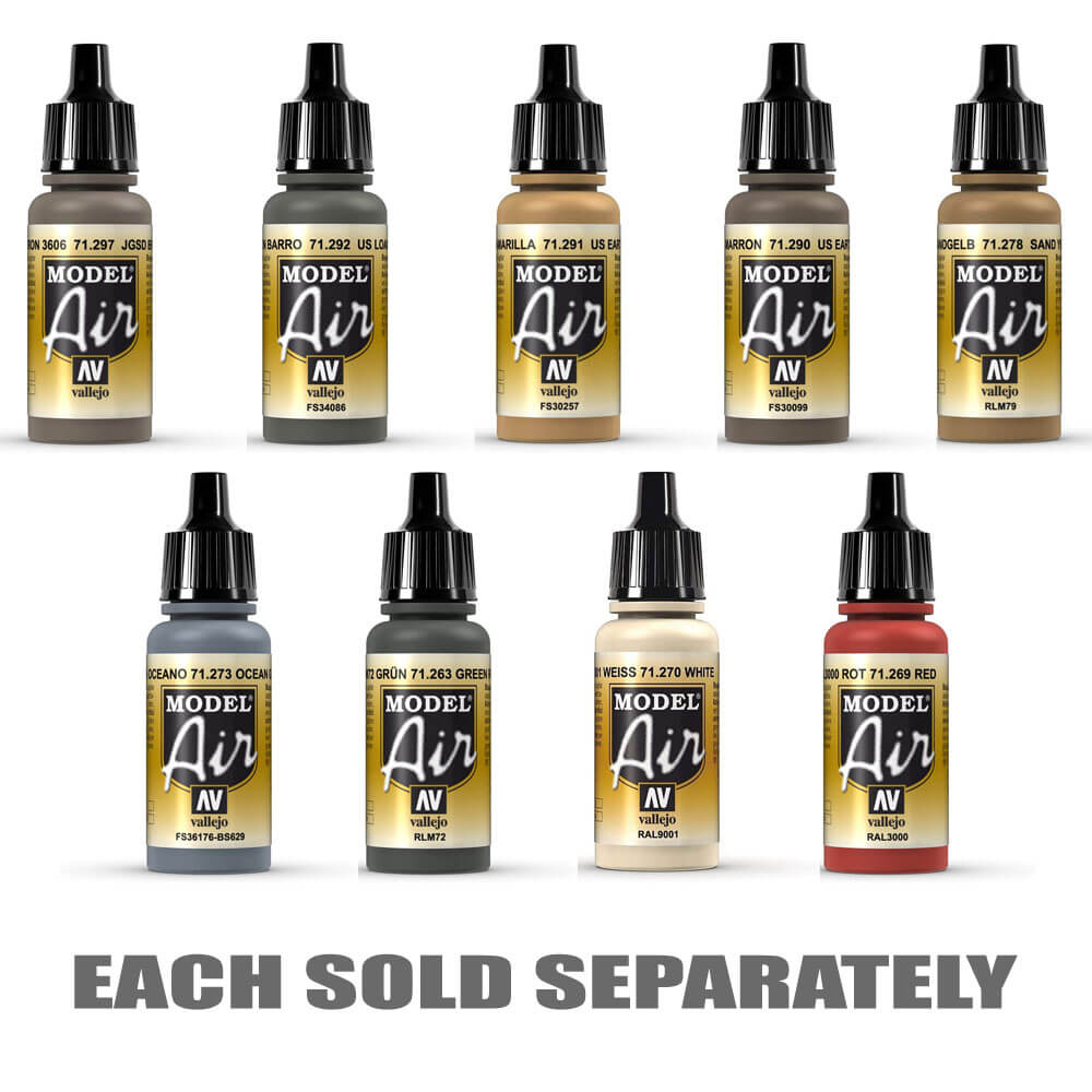 モデル空気は、特にエアブラシの技術用に開発された液体アクリル色の範囲であり、非常に細かく接合された樹脂と、極端な耐性と耐久性の特性を備えたアクリル樹脂です。フォーミュラには、水ベースのアクリルで入手することは不可能な特性を備えた新しいアクリル樹脂が含まれています。モデル空気の抵抗、硬度、カバーパワーは、エアブラシのために既知のアクリルよりも優れています。エアブラシの色に使用される顔料は、エアブラシバルブの閉塞を避けるために、可能な限り最高の一貫性に粉砕する必要があります。モデルの空気式で使用される顔料の革新的なフライス加工プロセスは、モデルに色を適用するときに画家の技術的保証と最高のテクスチャを提供し、洗浄および洗浄および洗浄用のためにブラシで色を適用するときに非常に優れた品質を生成します。希釈されたglazesの透明度と層状適用