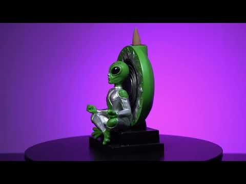 Bakstrømningsrøkelsesbrenner med Quirky Hippie Alien Design. Alien har på seg et blått og lilla hodestykke med et gullfredssymbol. Duftende røyk renner ned og ut av fremmedens munn på en pulserende blomst når en opplyst røkelseskjegle plasseres på toppen. Passer for røkelsekegler.