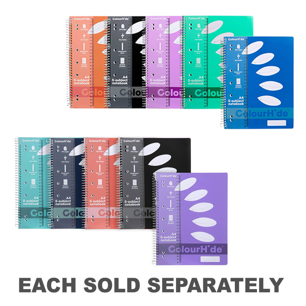 Colourhide Notebook er et flott verktøy for å notere notater og informasjon, enten det er for skole, universitet, arbeid eller hjem. Den har en spiralsidebinding og et hardt dekke for polypropylen for ekstra beskyttelse, og 250 sider med god plass til å skrive. Det er atskilt i 5 separate fag, slik at du kan organisere notater og informasjon.