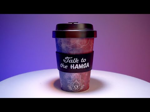 - Matchende svart anti-spill lokk og beskyttende silikonbånd med punny-setningen 'snakk med Hamsa'.