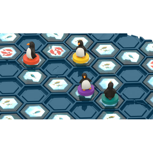 In Hey, That's My Fish!, players want to catch as many fish as possible with their waddle of penguins. Each turn, a player moves one penguin in a straight line over hex-shaped ice tiles with 1, 2 or 3 fish on them. The player then collects the hex from where the penguin started its movement from the table, thereby creating a gap which penguins can't cross on future turns. When a penguin can't move, it's removed from play with its owner claiming the tile on which it stands. The player who collects the most fish wins.