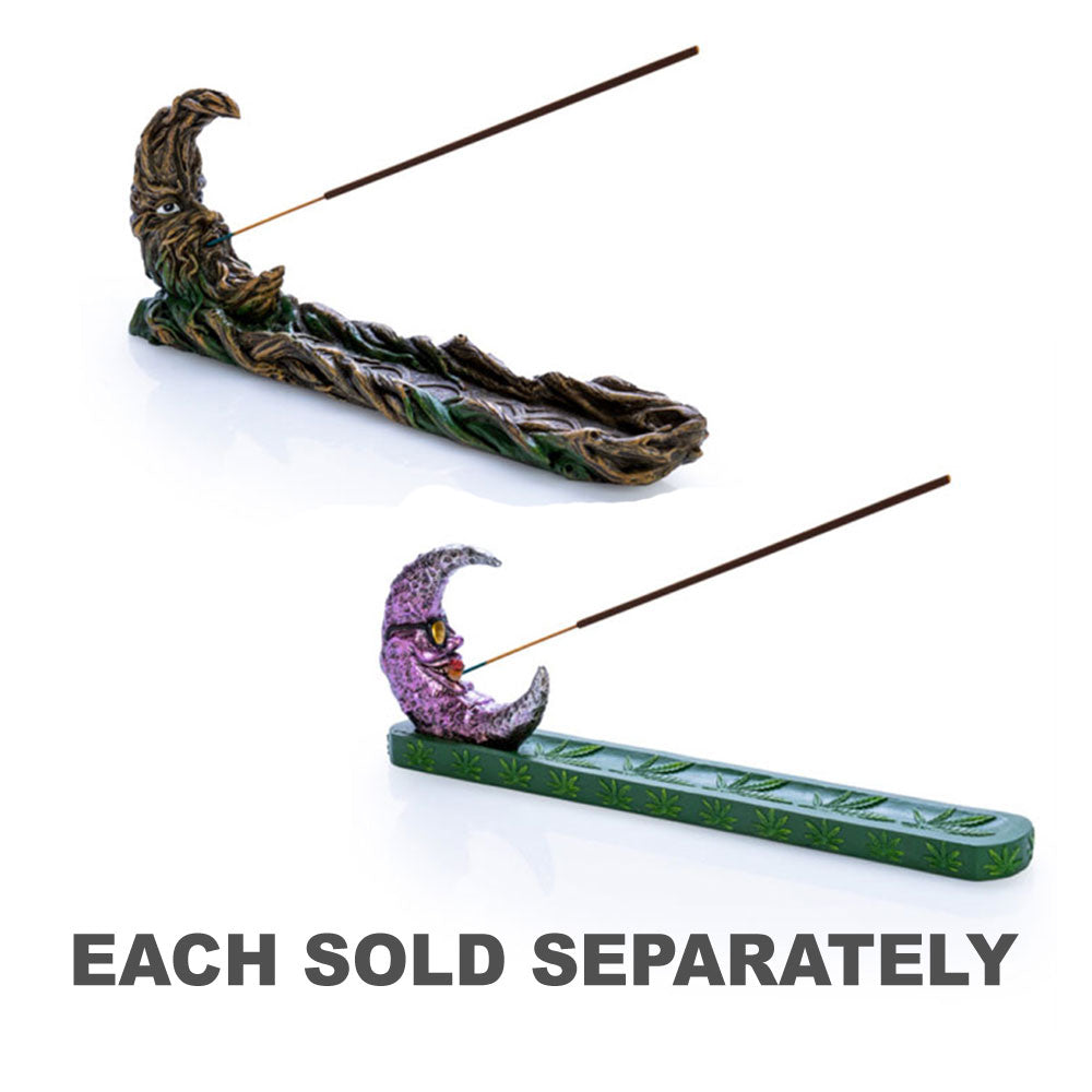 Mystisk horisontal røkelsebrenner formet som en halvmåne. Wise Moon har et mildt ansikt og gnarly, trebark tekstur