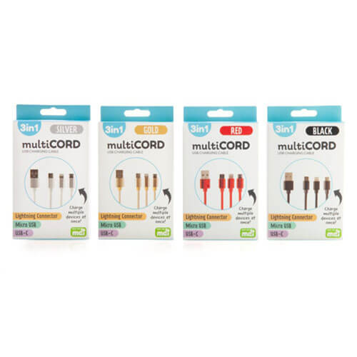 Wielofunkcyjny przewód ładujący z 3 różnymi typami złącza.