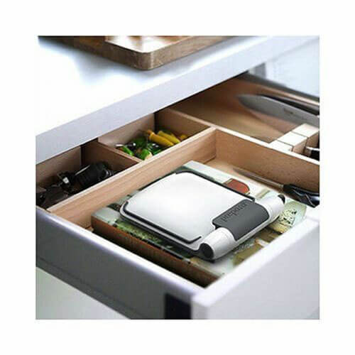 • Zabezpiecza łatwo w szufladę lub szafkę, w tym styl, który schowuje się w obszarze „zawiasu”