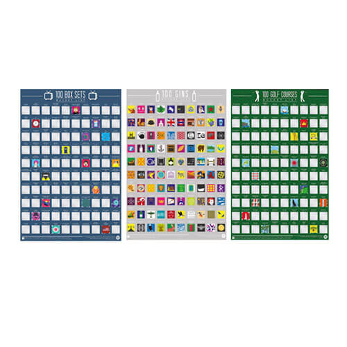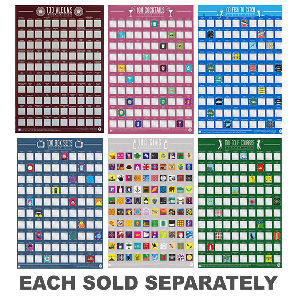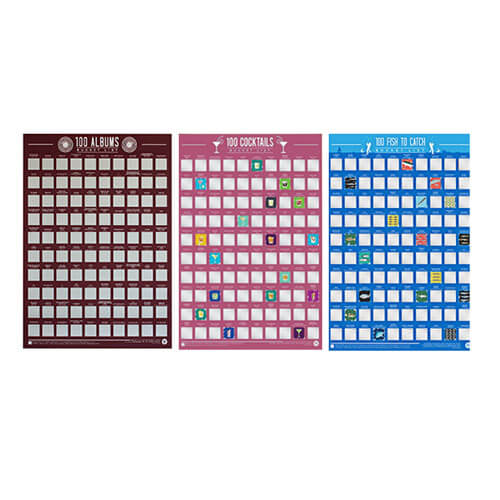 Våra skrapning av hinklista -affischer med olika teman sammanställer 100 av ... vad som helst! Dessa vackra affischer låter dig skrapa när du går för att avslöja vad som gömmer sig under nästa ruta.