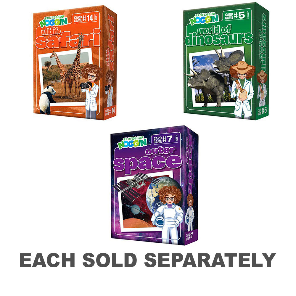 Det är 2020 -utgåvan av professor Noggin med alla nya foton! Utforska alla saker som pågår i det yttre rymden. Lär dig fascinerande information om planeter, månar, rymdskepp, satelliter, asteroider och mycket mer! Var och en av dessa kortspel testar spelarnas kunskap om olika ämnen på två färdighetsnivåer. Varje spel består av 30 stora, robusta, kort, en tre-numrerade tärningar och instruktioner. Korten har färgillustrationer eller fotografering som skildrar ett djur eller objekt och två uppsättningar av triviafrågor på den andra. Enkla frågor är inriktade på yngre barn och personer med lite kunskap om ämnet, medan den hårda nivån är för dem med lite mer kunskap. En spelare rullar tärningarna, plockar upp ett kort och ställer en annan spelare en fråga. Om spelaren får frågan rätt, får han eller hon behålla den, men om de svarar fel, berättar läsaren alla spelare rätt svar, och den går tillbaka till botten av högen